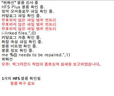 디스크 유틸리티 자체로 해결이 되지 않는 경우에는 그 손상 정도가 조금 심해 치료를 할 수 없는 상황이므로, OS X용 Disk Warrior 등으로 치료를 해보아야 할 것이나 해당 프로그램이 없으실 듯하네요.
