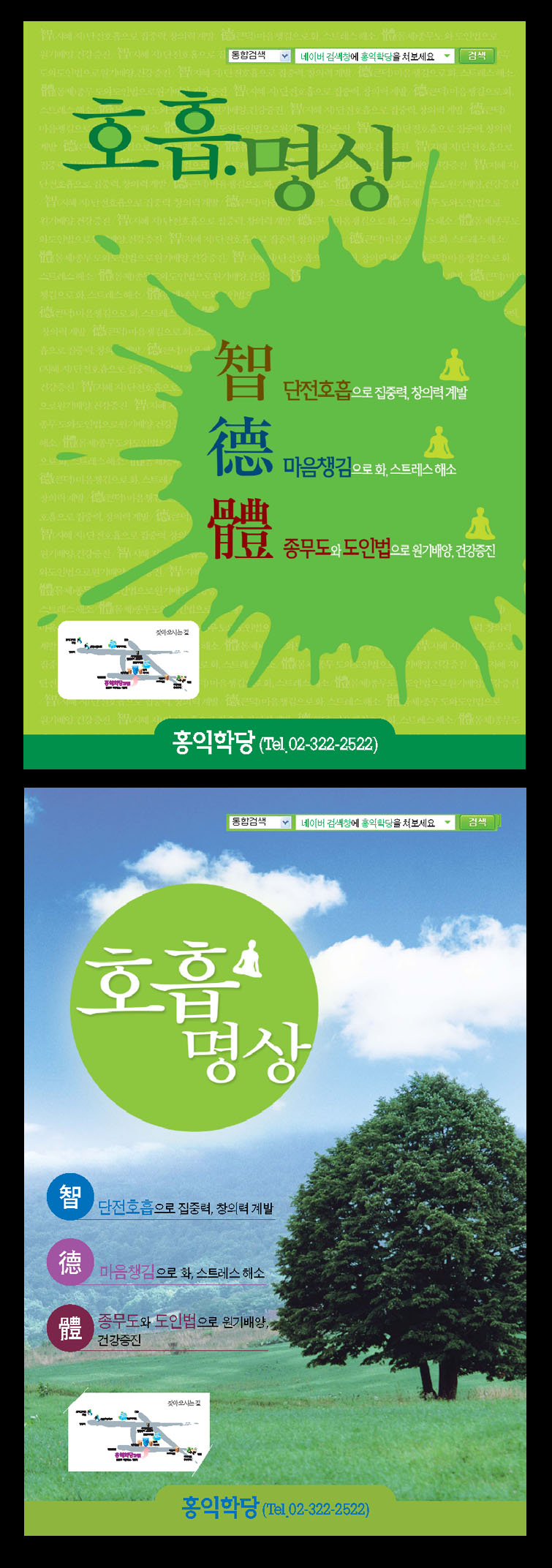 타이틀 서체를 다른것으로 해보시는것도 좋을것 같네요.예를들면 유려체라던가 아님 진인체 같은 캘리그라피 형태의 폰트도 좋겠네요. 회원님중에 무료로 써주시는 분 계시던데 부탁해보세요. ㅎㅎ 가부좌 자세의 아이콘은 없어도 될거 같구요.