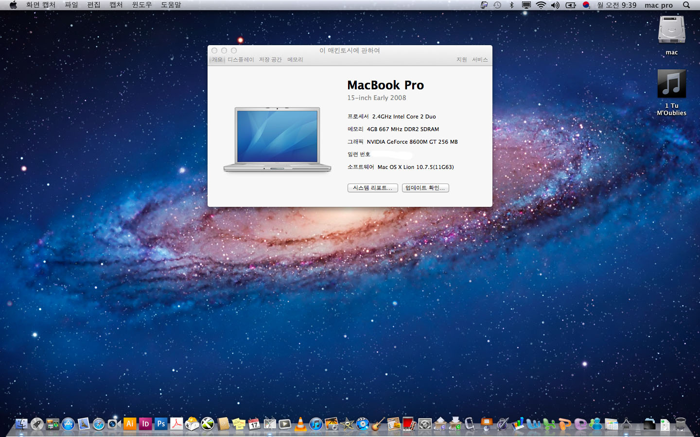 2008년 맥북프로 15인치- 맥 디자인프로그램들이 사진처럼