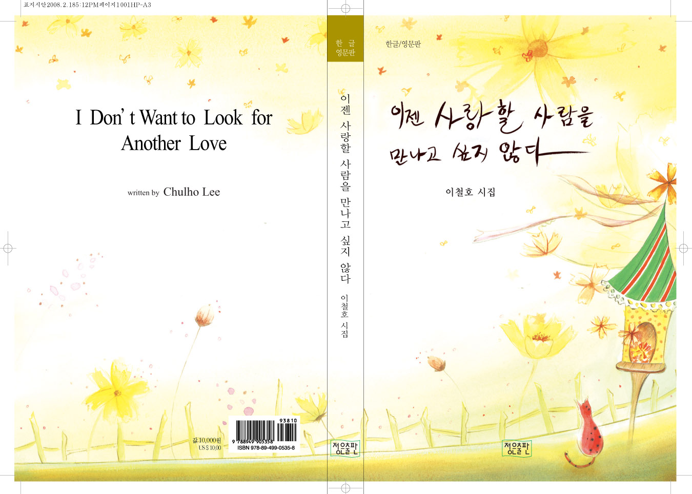 일단 제가 이 작업물을 보고 느낀점을 잠깐 이야기할게요.. 먼저 책의 제목 컨셉트와 일러스트 랑 따로 노는 느낌..입니다. 일러스트나 다른 비쥬얼 이미지는 책의 느낌을 강하게 살리는 분위기로 잡아야 하는 데 비쥬얼쇼크보단 비쥬얼노이즈가 더 강하게 어필된다는 게 일단 제 생각이구요. 이말을 더 자세히 풀면, 타이틀이 통일되어야 겠다는 생각이 들어요. 캘리면 캘리.. 폰트면 폰트, 그리고 디자인 컨셉트도 약간 정리가 되어야 겠습니다. 영문이랑 국문이랑 따로 따로 간다는 게 약간 에러같구요. 이철호 시집에 더 비중을 두느냐, 제목에 더 비중을 두느냐, 는 저자분과 이야기 되어야 겠구요 마지막으로 어퍼스트로피 입력하는 방법도 배우셔야 겠습니다. 이건 쪽지 주시면 알려드리겠습니다.